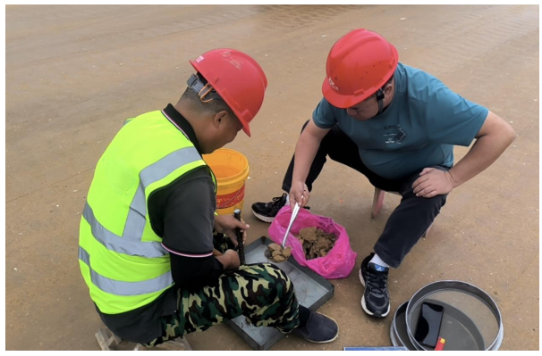 淮桐1標(biāo)現(xiàn)場檢測員正在進行壓實度檢測。